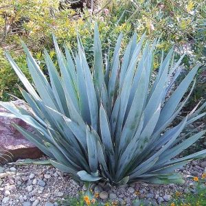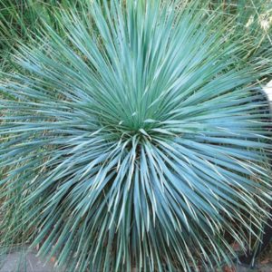Yucca pallida ‘Blue Powder’ is a deer resistant selection that forms short 20-inch tall by 30-inch wide single rosettes. The wide and slightly twisted powder-blue leaves with very pale yellow edging are somewhat stiff but not stiff as Yucca torreyi. When mature, its clumps are topped with 3-foot tall spikes holding white bell-shaped flowers, a hummingbird favorite. It’s hardy to 0 °F once established.